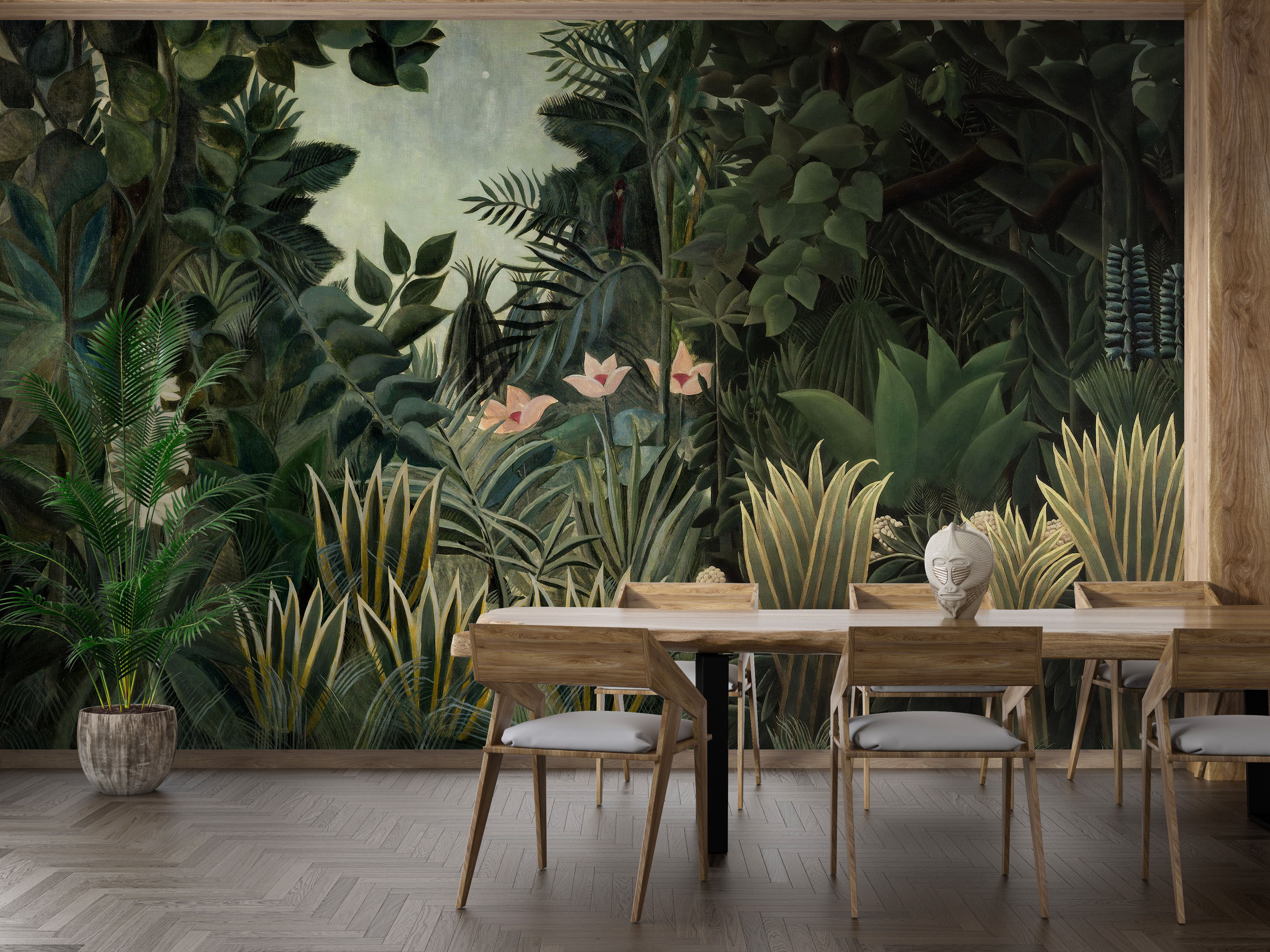 Choosingjungle wallpaperis an immediate way to make a dramatic and exciting statement in any room. These designs go beyond simple patterns; they often feature oversized, dense foliage, such as banana leaves, large palms, and exotic flora, often layered to give a feeling of deep, lush thickness. The intense use of rich greens, sometimes paired with deep blues or unexpected pops of colour, brings a truly wild and adventurous atmosphere indoors. This type of wallpaper works brilliantly as a focal point, instantly drawing the eye and making the space feel vibrant and full of energy, like stepping into a tropical ecosystem.